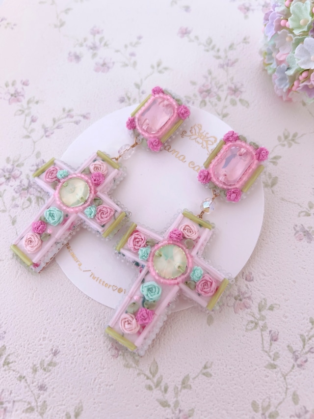 — 進む方向を示してくれる十字 — リボン刺繍とビーズを贅沢にあしらった、存在感のあるクロスピアス。 小さな薔薇をひと針ずつ丁寧に刺繍し、 縁にはビーズを一粒一粒縫い付け、中央には上品に輝くストーンを添えました。 細部まで手仕事で仕立てた、特別な一点です。 ボリュームのあるデザインながら、布製のため見た目よりも軽く、長時間でも身につけやすい仕上がり。 甘さと凛とした印象をあわせ持ち、 コーディネートの主役になる存在感があります。 オリジナルBOXにお入れしてお届けいたします。 箱を開ける瞬間から、ときめきを感じていただけますように♡ 特別な装いにも、 自分らしくありたい日のアクセントにも。 サイズ:約9×4.5㎝ ※着画は、イメージです。サイズ感の参考にしてください。