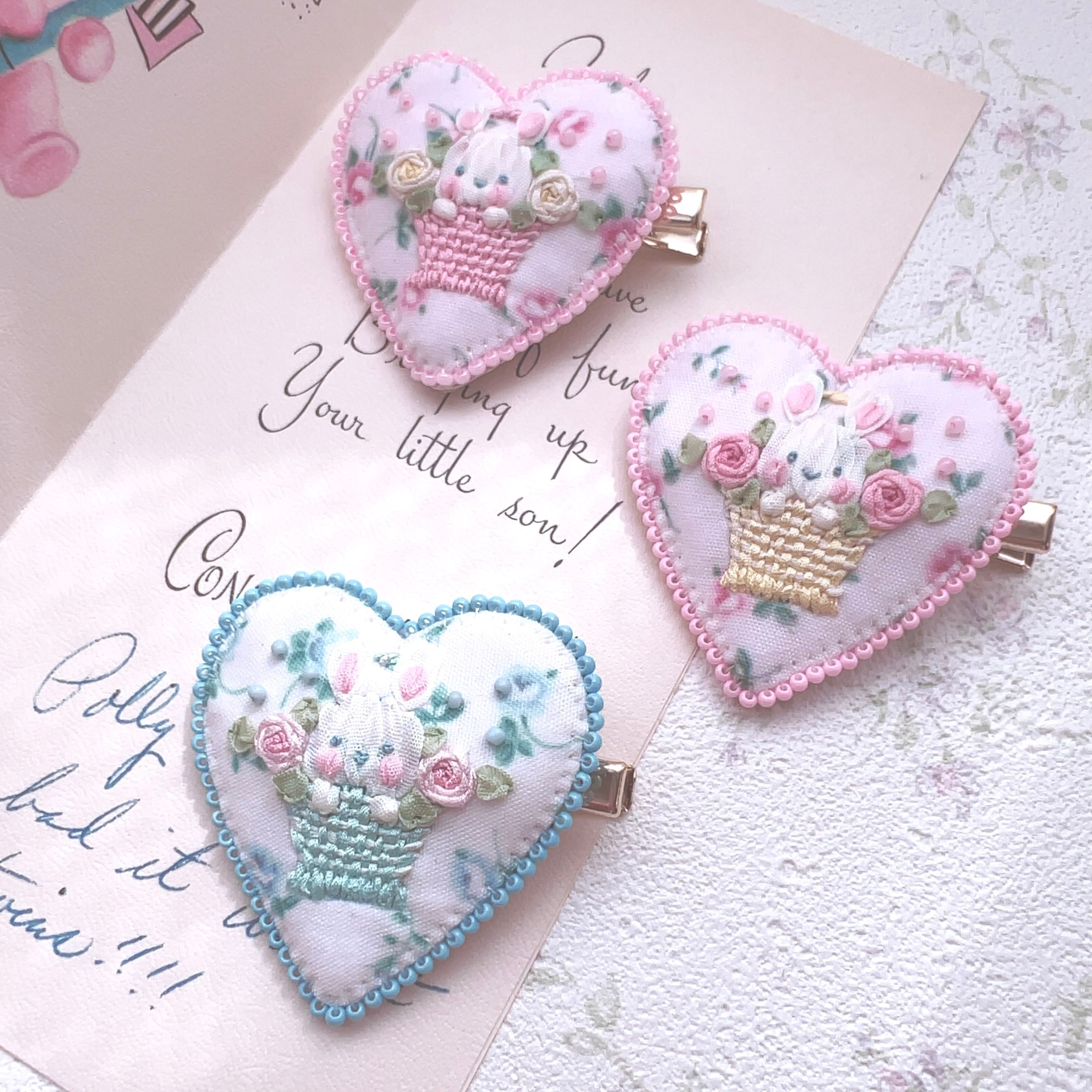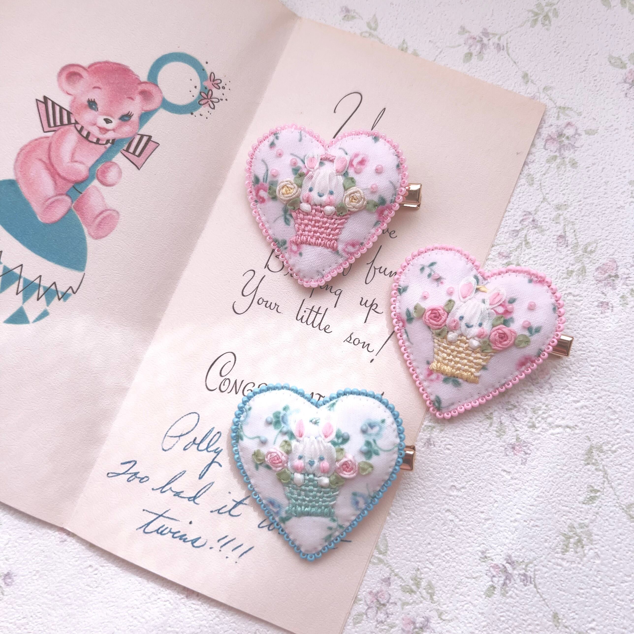 お花のバスケットにウサギちゃんが入っちゃった!?リボン刺繍で表現し、ビーズでぐるりとハートの周りを縫い付けたり細部までこだわりが詰まった、とっても可愛いクリップが出来上がりました♡