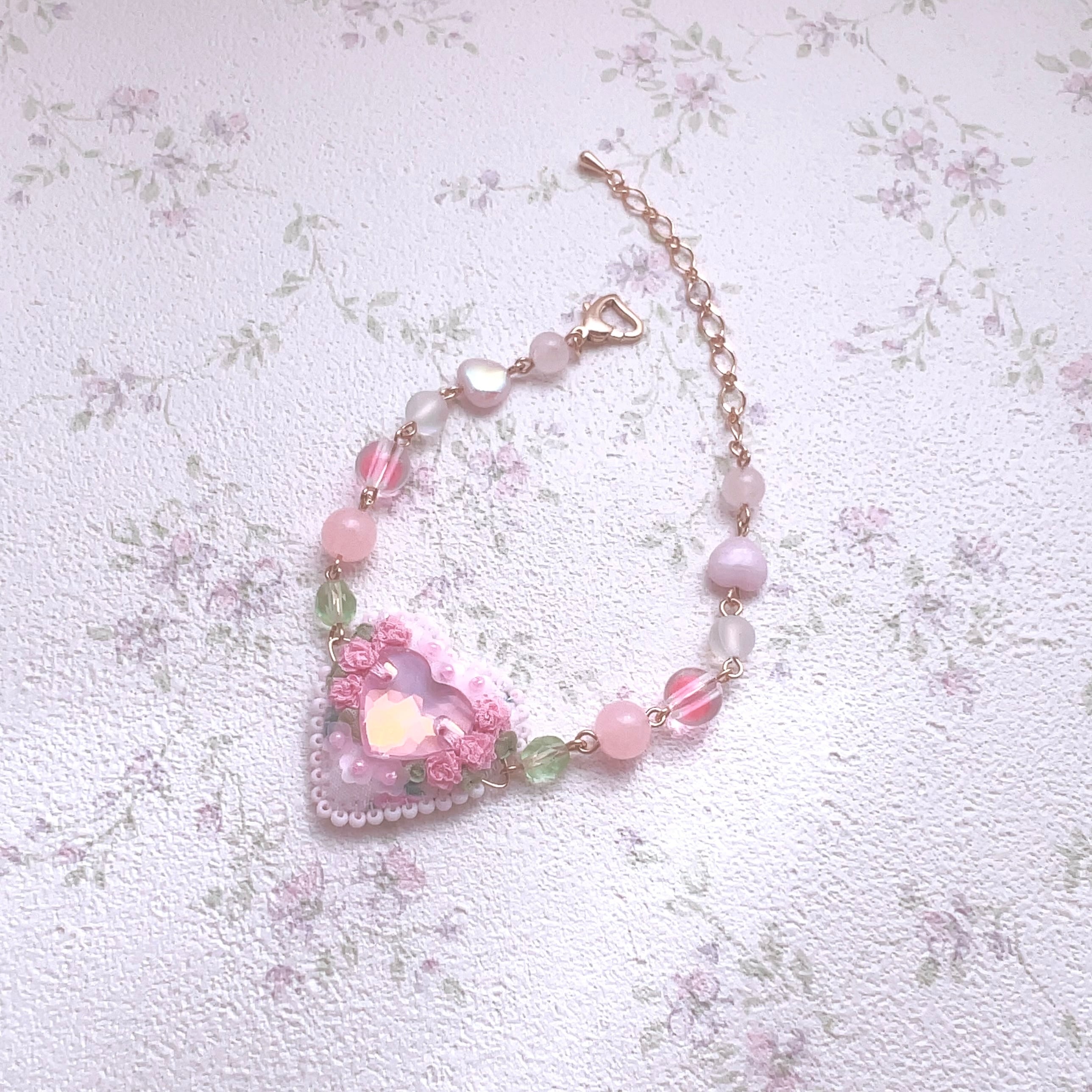 ハート型にぎゅぎゅっとお花とビジューを詰め込んだブレスレットになります♡