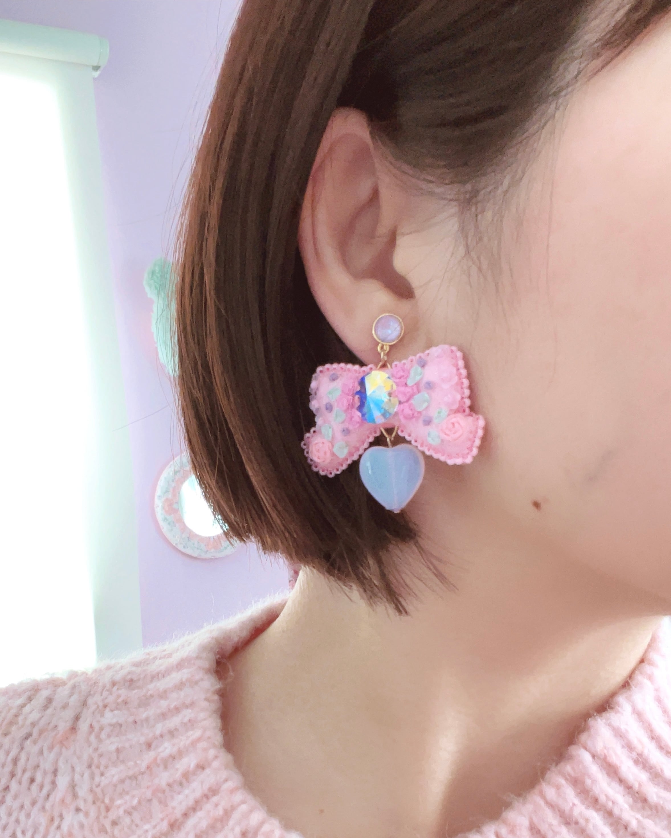 淡く光るビジューと揺れるハートが、耳元できらり♡