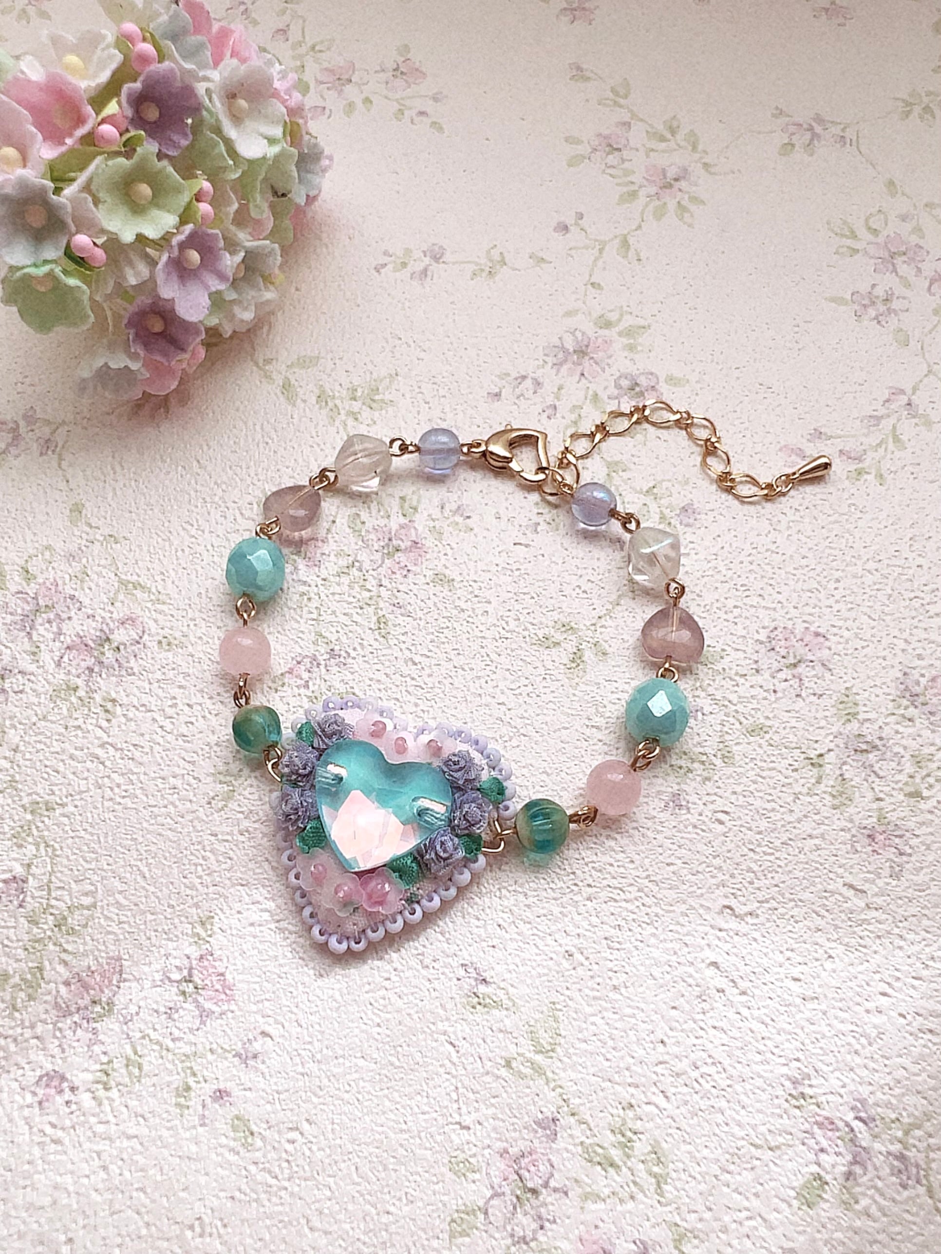 ハート型にぎゅぎゅっとお花とビジューを詰め込んだブレスレットになります♡