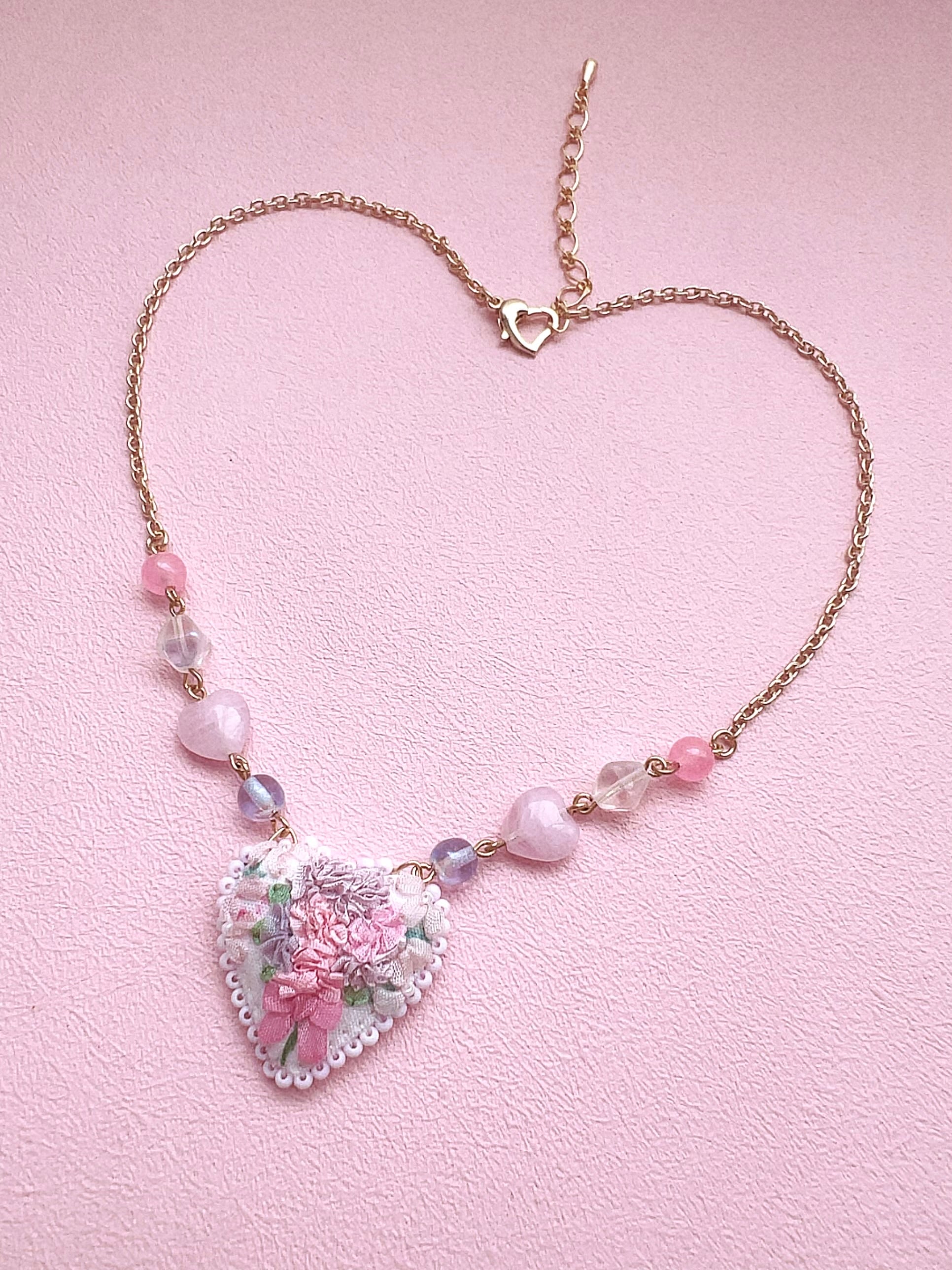 ハート型にぎゅぎゅっとお花とハートのビジューを詰め込んだネックレスになります♡