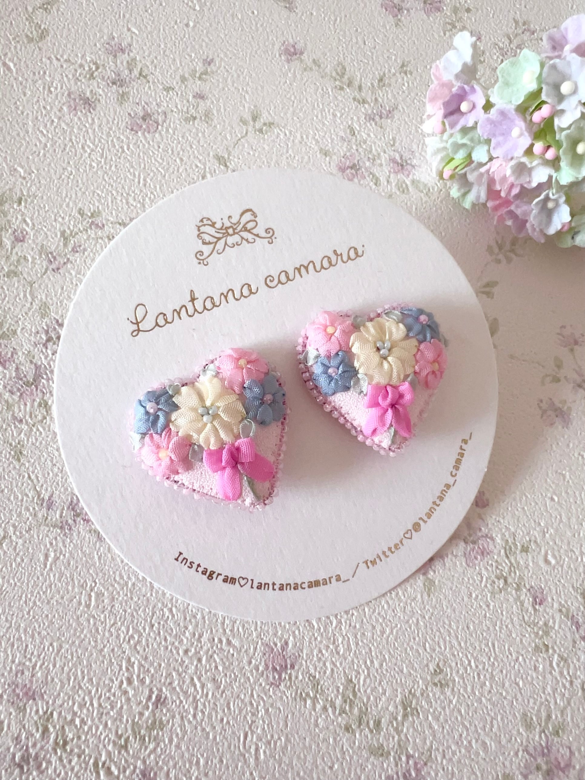 ミニサイズのハート型にお花のブーケをギュギュッと詰め込んだイヤリングになります♡