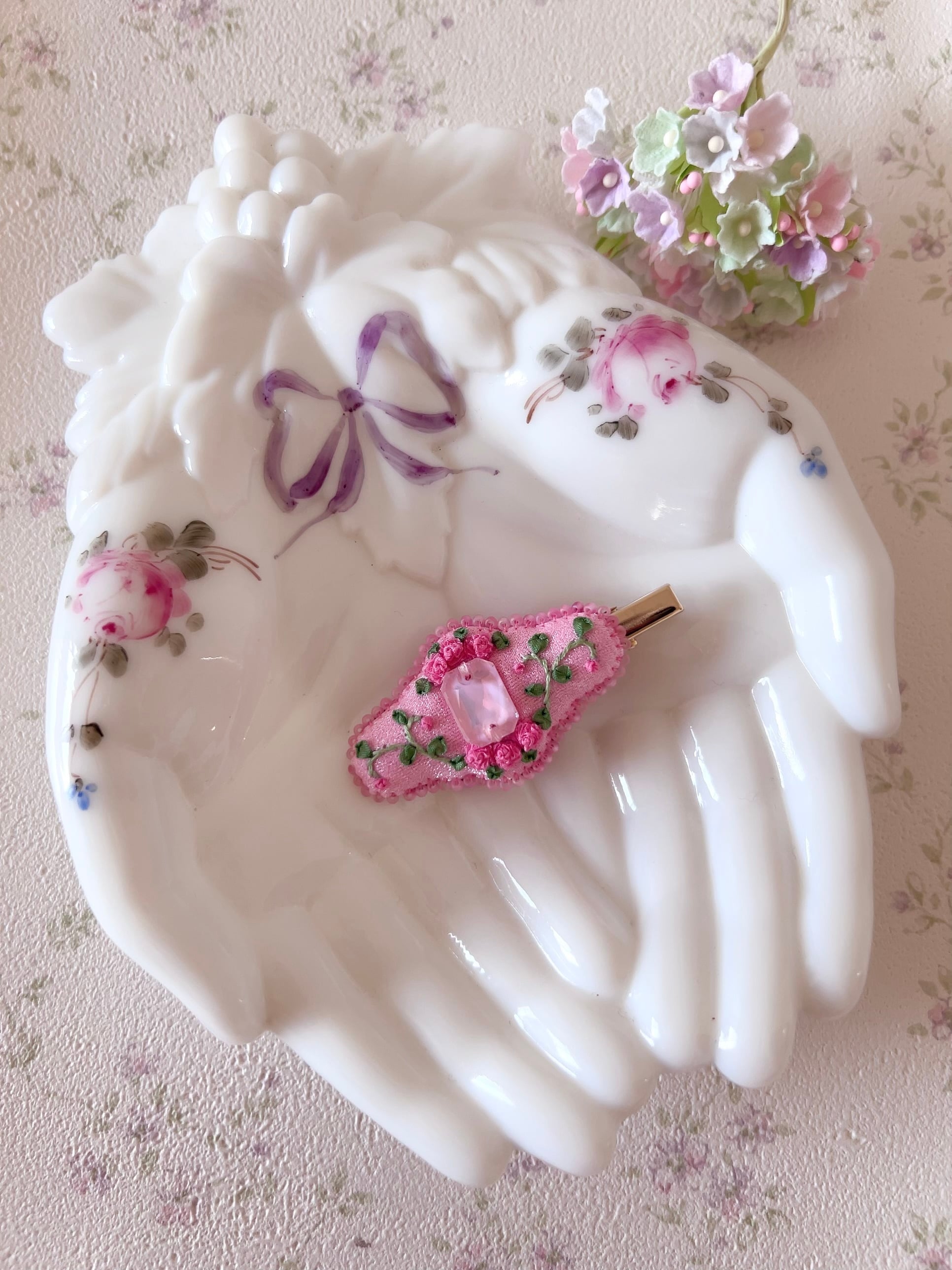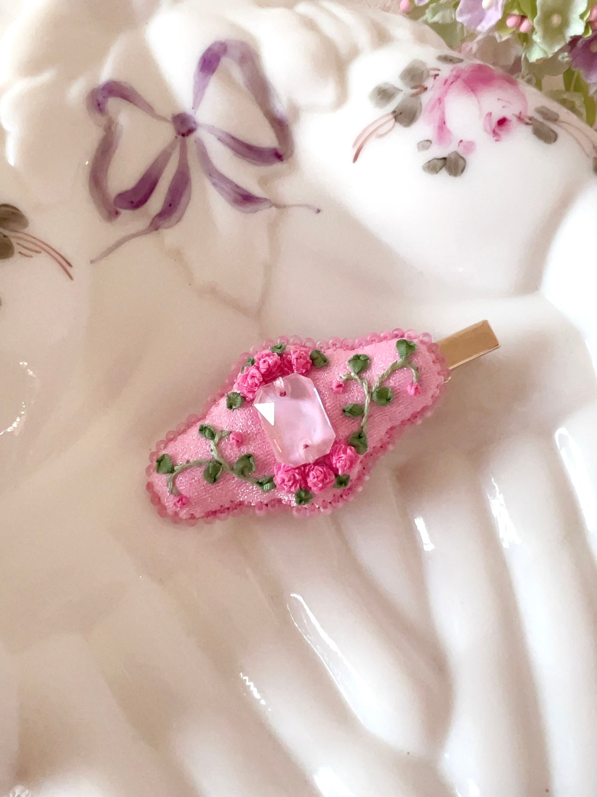 繊細な刺繍の薔薇と、光を集めるビジューが織りなす小さな庭園♡
